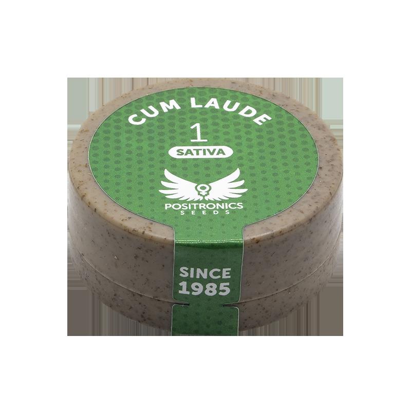 Cum laude es fruto de una triple hibridación entre plantas con alto componente sativo, para desarrollar una línea estable de Sativa pura. Asombroso crecimiento veloz, con típica forma de abeto, que cambiará a candelabro con las podas, por lo que se aconseja disminuir al máximo el periodo vegetativo. Tiene alta distancia internodal, pero la estructura de ramas y tallos soporta el peso de los grandes racimos florales, y de sus verdes hojas, muy estrechas y aserradas. Es resistente a los hongos.